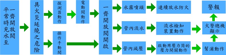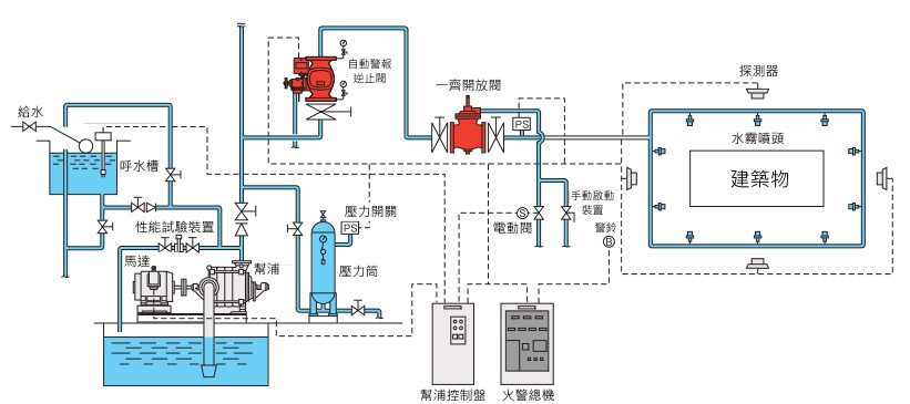 水霧設備用於防護古蹟等重要文化財,本設備安裝於建築物外圍,可與火災探測器連動或以手動的方式啟動放水、形成水幕,防止飛來的火屑及輻射熱造成火災。另外,亦可用於劇場的舞台及觀眾席,以達到防止延燒的效果。